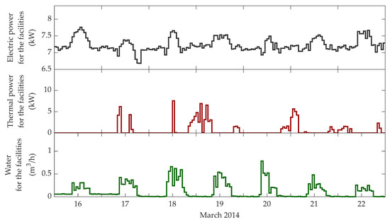 In respect to the resources considered as outputs (demands) of the energy hub, the electricity consumption of the pumping systems of the solar collectors (0.1943 kW), the MD plant (0.1720 kW), and the nanofiltration plant (0.2502 kW) were taken into account in the problem separately, as device-dependent outputs (, , and , respectively), allowing us to relate them to the on/off state of each pump. In addition, the value of in is fixed at kW/m3, considering the experimental data and model provided in Ref. [26]. The rest of the demands (, , and ) were calculated by processing the real historical data measured by the sensor systems of each of the plants considered in the agro-industrial district (see Figure 4). At this point, note that both CIESOL’s consumption profile and the parking’s size have been ten times reduced for a more realistic test.