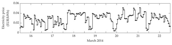 On the other hand, all the elements of vector except and are equal to zero because there is no possibility to sell the resources of outputs 2 to 6 (as represented in Figure 2). Water is considered to be sold at a much lower price ( EUR/m3) because many Almerian farmers, who usually make use of private wells, have been claiming to the local councils that the price of desalinated water should be subsidized to achieve competitiveness by keeping it around 0.2–0.3 EUR/m3. In addition, the actual hourly electricity prices from intraday markets, together with the generation fee of 0.5 EUR/MWh and the 7% tax on the value of electricity generation, are considered to obtain (see Figure 5), as further detailed in Ref. [19]. They show an overall tendency to fall during midnight or early morning and correspond to period of time selected for this study, between the 16–22 March 2014, which was chosen because of the combination of several given conditions: relatively high consumption of water, simultaneous heat demand at the greenhouse, and presence of both overcast and clear sky.