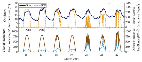 Finally, the meteorological variables attached to the solar production models are presented in Figure 6. Over the week of data, one can observe that on 16–19 and on 21 March, it was sunny with some passing clouds on 18 and 21, whereas the two other days (on 20 and 22) were nearly overcast. This phenomena is noticeable in the rising and falling peaks of both the direct and global irradiances, and also in the diffuse radiation, which tend to increase due to cloudiness. The temperatures demonstrate the typical warm climate of the region, with a minimum of 8.4 °C on 16 March, a maximum of 24.4 °C on 17 March, and a growing tendency, if de-seasonalized, because of the arrival of spring.