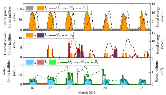 On the contrary, the differences found between Case 1 and Case 2 are mainly justified from Figure 8 and Figure 10. Since the desalination plant is no longer able to work at a partial load in Case 2, the amount of excess water that would be produced in comparison to Case 1 does not compensate the additional energy required for it. In other words, as the levels of irradiance and stored energy close to the dawn and the dusk are not enough to cover the needs of the plant operating at its maximum capacity, owing to physical constraints, it is preferable to use water from either the public network or the nanofiltration plant. This fact is noticeable in the increase of water coming from these sources in Figure 8 and in the amount of electric energy supplied to on 20–22 March (Figure 10). For the same reason, Figure 10 shows a minor usage of , in comparison to the same variable in Figure 9. Finally, why a first glance might look like a baffling performance on 18 March, when is no longer used to store heat, is explained because in Case 1 the biomass boiler is used to feed the desalination plant (see Figure 9), whereas in Case 2 it is used to feed the facilities, but the amount of consumed biomass is altogether the same, as summarized in Table 6.