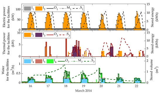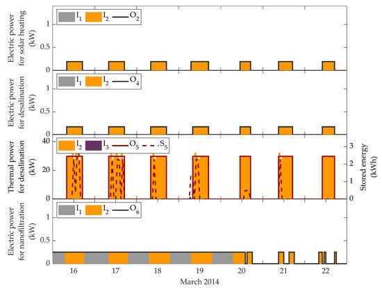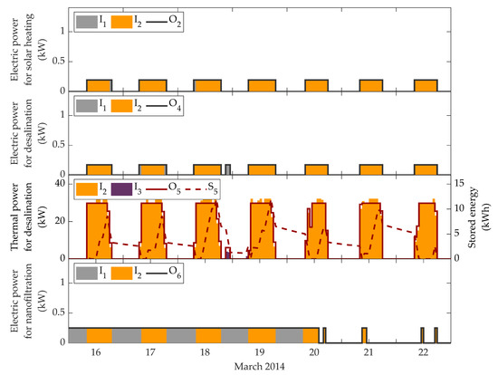 Regarding the similarities in both cases, the broad strategy to schedule the dispatch of resources over the week consists in making use of the solar energy to yield either energy or water from dawn to dusk at a lower cost. This is close to zero, since radiation was considered to be freely available (), but not exactly zero because sometimes using electricity or biomass compensates the cost of acquiring water from the public network, which is the case for the nanofiltration plant on 16–20 March (Figure 8 and Figure 10). In Case 1 (but not in Case 2), this also happens to the desalination plant on 18 March night (Figure 9) and on 17’s dawn and dusk, when the modules were allowed to operate at partial load. As a result that the electricity price tends to be higher around midday, except for 20 March (see Figure 5), and the electricity demanded by the facilities (CIESOL and the greenhouse) remains quite stable at about 6 kW, most of the electricity produced by the photovoltaic field is either directly sold or stored to be sold straightaway after noon, when the price is still profitable (see Figure 7 and Figure 9). That is also the reason why no electricity is kept stored at night, given the abundance of solar radiation the following days and the lower price at that time. and are managed analogously, but they show more variability in the demand. Water () is required especially during the working time and when the evapotranspiration rises (as outdoor temperature and irradiance do), which happens to be higher on 17–20 March (hence, storage is required during the previous night); whereas the thermal needs (), which are nil on 16 March, exhibit a quite irregular pattern.