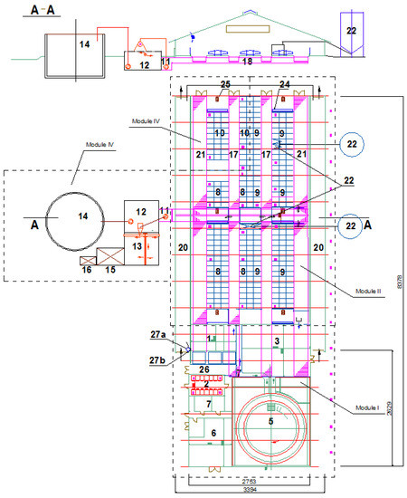 Module IV: 11—a tank for fresh slurry, 12—a tank with a liquid manure separator, 13—a solid fraction warehouse, 14—a tank for a liquid fraction of slurry, 15—a mixer-dryer, and 16—an organic-mineral fertilizer granulator.