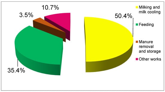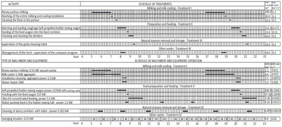 The schedule of a working day for service, machinery, and equipment (own study) in a module cattle barn.