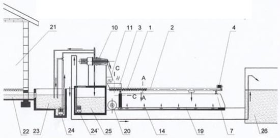 2]: 1—a screw conveyor, 2—a tube housing, 3—a hopper basket, 4—a motor with motor reducer, 7—a cell wall (silo), 10—a separator, 11—a trough, 14—a transverse channel, 18—a longitudinal channel, 19—a wide grid, 20—a ventilator, 21—the livestock building, 22—a drainage channel, 23—a pre-tank for slurry, 24—a rotodynamic pump, 24’—a pump, 25—a separated slurry tank, and 26—a liquid fraction storage tank (own study).