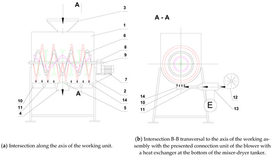 - Romaniuk, W.; Łochowski, B.; Domasiewicz, T.; Borek, K.; Savinykh, P.A.; Kosolapov, V.M.; Otroshko, S.A.; Shevtsov, A.B. Mixer-Dryer. Patent No. P.417502, 9 June 2016. [Google Scholar]