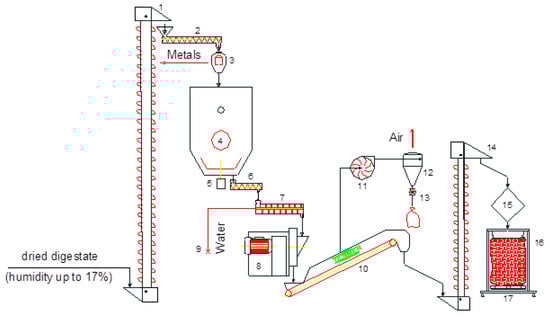 A technological diagram of an exemplary assembly line for granulation of dried post-fermentation subtract: 1—bucket elevator (2.2 kW), 2—screw conveyor (2.2 kW), 3—magnetic detector, 4—tank with filling, 5—tank lifting agitator (2.2 kW), 6—screw feeder (0.75 kW), 7—conditioner (2.2 kW), 8—granulation press (11 kW), 9—water dispensing installation, 10—conditioner (0.75 kW), 11—centrifugal fan (2.2 kW), 12—cyclone, 13—subcyclone sluice (0.55 kW), 14—bucket elevator (2.2 kW), 15 and 16—loading station, and 17—weighbridge (own study).