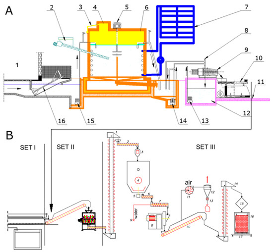 B) substrates (own study). A—Schematic diagram of an agricultural biogas plant with a separator for the fermented substrate to a solid fraction with a storage system and liquid fractions: 1—livestock building, 2—fermentation chamber, 3—biogas pipeline to the biogas purification plant, 4—agitator, 5—overflow pipe, 6—feeder for plant substrates, 7—solar collector with pump and heat exchanger, set A: 8—separator, 9—a pipeline for feeding liquid digestate with overflow pipe from the separator, 10—screw relay, 11—plate for separated solid fraction, 12—intermediate tank for separated liquid post-fermentation fraction, 13—slurry agitator in slurry channels; 14—pump with fresh slurry feeding pipeline, 15—pump with slurry mixing and feeding pipeline to the separator, and 16—pump for pumping separated slurry. B—Solid fractional mixer-dryer and process line for granulating the dried substrate. A detailed description of the individual markings is shown in