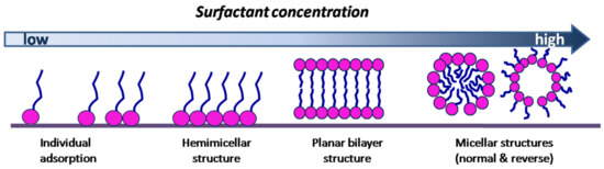 At low concentrations, surfactant molecules exist independently in solution or are discretely arranged on the o/w surface, while the surface tension is insignificantly modified. The increase in surfactant concentration is accomplished by the addition of more molecules at the o/w surface with a considerable decrease in the surface tension of the solution. This tendency is kept until the surface becomes saturated, whereby the formation of the micelles is initiated, at which point the surface tension no longer changes (Figure 1).