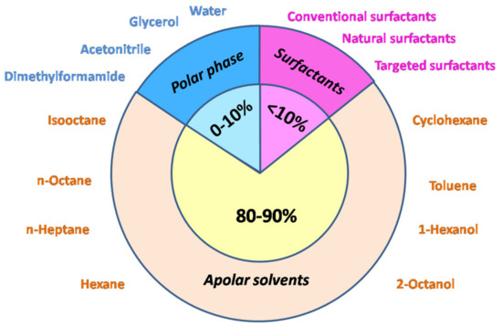 The quantitative weight of surfactants in the ternary mixtures does not represent the most important contribution to the overall properties of the RMs (Figure 3) (e.g., size and shape of water droplets, polydispersity, and droplet interactions), with their major role being conferred by the elastic properties of the interfacial layer [41]. Most RM systems can be prepared using surfactants with different chemical structures, whether ionic or nonionic, depending on the nature of the hydrophilic and hydrophobic groups.