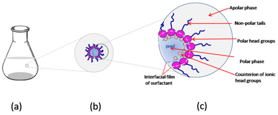 Reverse micelles are composed of aggregates of surfactant molecules structured in a polar core of hydrophilic headgroups, with their hydrophobic tails directed outside into the organic bulk. The concept of surfactant aggregate formation was initially proposed for an aqueous medium by James William McBain in the early 1910s, while, two decades later, G.S. Hartley named this concept “micelle” (from the Latin “mica” which means small particle), a term borrowed from biology [61]. The term “reverse micelles” originated much later, in the 1970s, specifically defining the reversed/inverted situation of a normal micelle, consisting of an amphiphilic aggregate formed in a nonpolar hydrophobic medium.