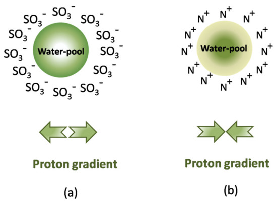 Proton gradient inside the water pool of the reverse micelle of (a) an anionic surfactant (e.g., AOT), and (b) a cationic surfactant (e.g., CTAB).