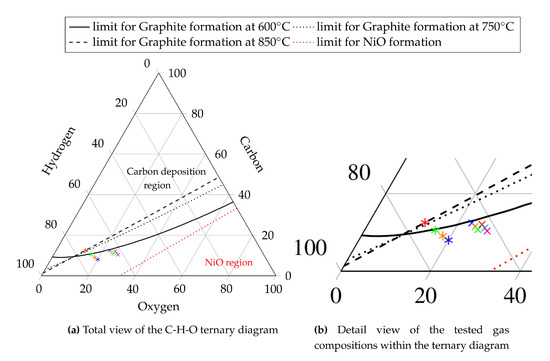 - Sasaki, K.; Teraoka, Y. Equilibria in Fuel Cell Gases II. The C-H-O Ternary Diagrams. J. Electrochem. Soc. 2003. [Google Scholar] [CrossRef]