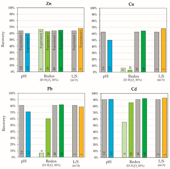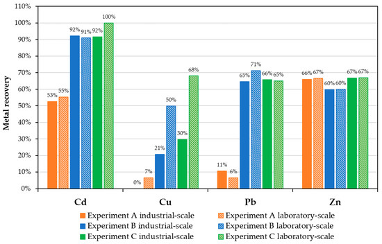 The recovery of Zn for both laboratory and industrial-scale experiments were between 60% and 70% regardless of the conditions (Figure 4). The use of H2O2 had no influence at all, whereas an increased L/S-ratio and lower pH value slightly but not significantly increased the recovery (Figure 2). Zn recovery thus seems to mainly depend on its input concentration and binding forms. The more Zn is present in FA, the more can usually be mobilized [15].