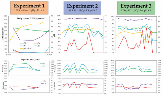 The industrial-scale experiments at the MSWI plant Linth provided time-resolved data over one day of the FLUWA process (Figure 3). The time-resolved sampling of input-FA, leachate and filter cake allowed to determine the metal recoveries (Formulas (4) and (5)). The simultaneous pH monitoring in the last reactor of the FLUWA process helped to identify the potential and limitations of the recovery for the metals Zn, Cu, Pb and Cd.