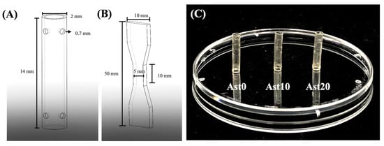 Schematic drawing of (A) the conduit and (B) the dumbbell-shaped sample used in mechanical testing. (C) A photograph of 3D-printed astragaloside (Ast)-containing polyurethane (PU) conduits.