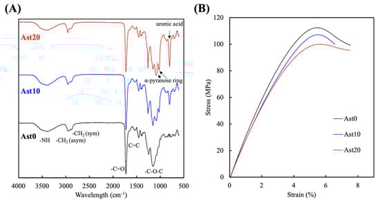(A) Fourier transform infrared spectroscopic (FTIR) spectra and (B) tensile stress–strain curves of the various 3D-printed Ast-containing PU nerve conduits.