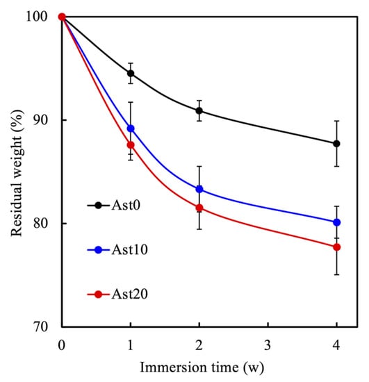 An ideal nerve conduit should have adequate degradability to allow the efficient nerve repair process to take place. As mentioned, nerves regenerate at a rate of 1-2 mm/day, and regeneration usually starts after a period of rest []. Therefore, the degradation rate of all conduits immersed in SBF were analyzed and recorded at 1, 2, 3, and 4 weeks, as shown in Figure 4. Complete regeneration takes about 6 to 12 weeks; thus, an ideal conduit should have the majority of its mass at the end of 4 weeks. An increased degradation rate was observed in all conduits with longer immersion times, with the fastest degradation rate seen in the first week of immersion in SBF. The maximal weight loss in the Ast0 group was approximately 5%, with increased weight loss observed in Ast-containing conduits during the first week of SBF immersion. After immersion for 4 weeks, the weight loss in the Ast0, Ast10, and Ast20 groups was 12%, 19%, and 21%, respectively. The results shown above displayed the highest degradation rate in the Ast20 group, followed by the Ast10 group, and the lowest in the Ast0 group. In a previous study, the time taken for nerve regeneration was about 6 to 12 weeks, depending on the severity of injury. Therefore, logically, an ideal nerve conduit should be able to last at least 12 weeks to provide complete regeneration. Magnetic resonance imaging evaluation can also confirm nerve regeneration and recovery of function that are fully recovered about 12 weeks after the onset of nerve injury []. Thus, we can conclude that the degradability of nerve conduits is related and can be greatly enhanced with the addition of Ast, which is ideal for optimal nerve regeneration.