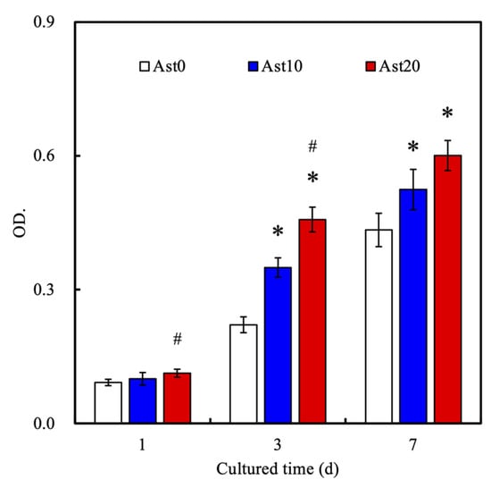 Proliferation of rat Schwann cells (RSCs) on 3D-printed Ast-containing conduits for 1, 3, and 7 days. * Significant difference (p < 0.05) from the Ast0 group. # Significant difference (p < 0.05) from the Ast10 group.