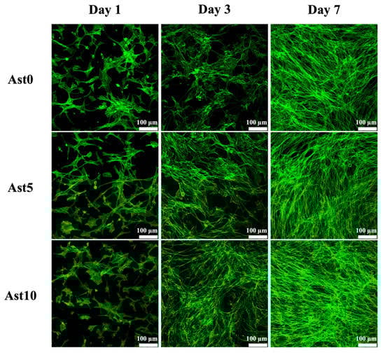 Figure 5 shows differences in the proliferation of rat Schwann cells (RSCs) cultured on different conduits. According to the results shown, the highest proliferation rate was observed in the Ast20 group, followed by the Ast10 group, with the lowest in the Ast0 group at all time points of 1, 3, and 7 days. The differences were obvious since day 1 of cell culture, with as ignificantly higher proliferation rate observed in the Ast20 group as compared to the Ast0 group. In addition, the differences in the cell proliferation rate were even greater in the Ast20 group in comparison to both Ast0 and Ast10 groups at days 3 and 7. In contrast, the proliferation rate in the Ast20 group after 3 days of culture was approximately 1.6- and 1.3-times higher than that in Ast10 and Ast0 groups, respectively. Besides, the Ast10 group also showed higher proliferation as compared to the Ast0 group at both days 3 and 7. These results indicated that the proliferation of RSCs is directly related to Ast concentrations, which is in good agreement with in vitro and in vivo studies conducted by Chen et al. []. According to their latest studies, in vitro results revealed that the addition of Ast upregulated the proliferation of neuronal stem cells but did not influence differentiation. In addition, 2 µg/kg of Ast was administered via the IV route into experimental stroke rat models, and results proved that Ast was able to upregulate the expression of nestin, p-epidermal growth factor receptor (EGFR), and p-mitogen-activated protein kinase proteins (MAPK), thus improving the repair of neurological function in the rats. Furthermore, it was also hypothesized that improved hydrophilicity of Ast leads to enhanced cell adhesion and attachment, therefore allowing for improved cellular behaviors such as proliferation. These results also showed that Ast is non-cytotoxic to cells, thus making it a potential candidate for further neural-related studies. Figure 6 shows the immunofluorescence staining results of RSCs with F-actin. At first glance, Figure 6 is in good agreement with the proliferation results above. There were more cells in the Ast10 group at days 1, 3, and 7 as compared to Ast5 and Ast0 groups, as seen by the area covered by cells. Furthermore, cells in the Ast10 group were flatter and had elongated spindles at day 1 as compared to the rest of the groups, thus indicating that the micro-environment was more favorable to RSCs. In addition, the RSCs cultured on the conduits with Ast stimulation showed longer axons and more spindle cells, which proved the positive influence of Ast stimulation on neuronal cell proliferation []. These data indicated that the addition of Ast can promote cellular adhesion and proliferation and can be used as a neurogenic factor in future nerve-regeneration-related studies.