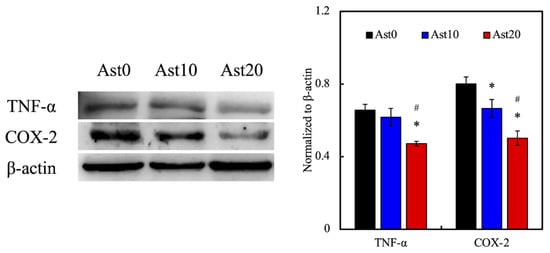 The expression levels of tumor necrosis factor-alpha (TNF-α) and cyclooxygenase-2 (COX-2) that were inflammation-related proteins in RSCs cultured on 3D-printed Ast-containing PU nerve conduits with different Ast concentrations. * Significant difference (p < 0.05) from the Ast0 group. # Significant difference (p < 0.05) from the Ast10 group.