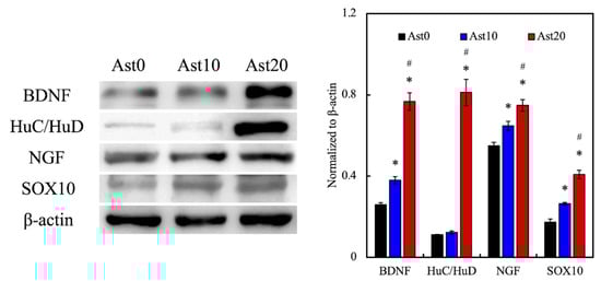 Western blot was used to evaluate the secretion levels of various neurogenic-related proteins. Brain-derived neurotrophic factor (BDNF) is a member of the neurotrophin family and is known to play a role in promoting the growth and differentiation of new neurons and synapses []. HuC/HuD proteins are mammalian embryonic lethal abnormal visual system (ELAV)-like neuronal RNA-binding proteins that are involved in neuronal development in both central and peripheral nervous systems and are great markers for determining the presence of developing neurons []. Nerve growth factor (NGF), just as its name suggests, is known to promote the proliferation, survival, and maintenance of neurons []. Sry-related HMg-Box gene-10 (SOX10), in contrast, is a nucleocytoplasmic shuttle protein that plays a critical role in the development of the neural crest and peripheral nervous system []. From the results obtained (as shown in Figure 8), the expression levels of all neurogenic proteins were the highest in the Ast20 group, followed by the Ast10 group, and the lowest in the Ast0 group. The secretion levels of these neurogenic proteins were directly related to the concentration of Ast. BDNF and HuC/HuD expression in the Ast20 group was even more than 2 times higher than that in the Ast0 group. Interestingly, similar expression levels of HuC/HuD were observed in both Ast0 and Ast10 groups. However, the HuC/HuD expression level significantly increased in the Ast20 group, indicating that Ast20 is a better concentration level for promoting nerve growth as compared to the other two concentrations. In addition, a study done by Cheng et al. revealed that the addition of Ast was able to positively regulate the nerve regeneration process through interactions with various receptors on nerve cells, such as tropomyosin receptor kinase A (TRKA) and p75NTR []. The TRKA receptor works by enhancing the expression level of B cell lymphoma-2, which leads to better nerve tissue regeneration []. Overall, these results suggested that Ast can enhance neural development and regeneration, which is consistent with other related studies.