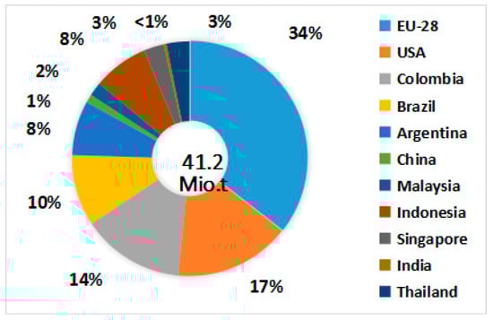 Biodiesel has attracted great interest for its potential to relieve environmental pollution and the energy crisis []. In the last decade, biodiesel has attained a remarkable growth in industrial production and consumption worldwide. The European Union (EU) leads in biodiesel production, with 34% of global production of nearly 41.2 million tons in 2018 (see Figure 1) [].