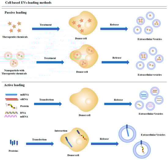 Cargos can be packaged into EVs with or without the help of donor cells. Thus, methods for encapsulating cargo into EVs can be roughly divided into two types: cell-based loading methods and non-cell-based loading methods. In the cell-based loading approach, cargos are usually delivered into the donor cells first. After being packaged into EVs, the cargos can be secreted and collected in an EV-carrying manner for therapeutic use []. The non-cell-based loading approach involves directly loading chemical or biomolecules into isolated EVs through electroporation, sonication, incubation, and/or transfection []. In the following content, these methods are reviewed according to the cargos.