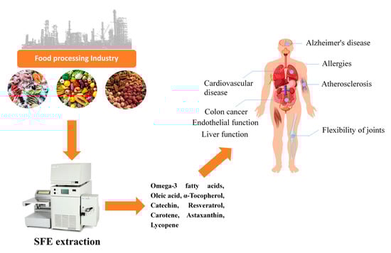Figure 1. Application of supercritical fluid extraction (SFE) in the recovery of natural active substances from food processing by-products and their beneficial effects on human health.