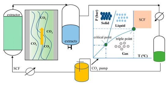 Supercritical fluid (SF) is defined as any substance that presents properties of both gas and liquid above its critical temperature and pressure (Figure 2). Under these conditions, SF has lower viscosity and higher diffusivity than traditional solvents, which allows increasing of the penetration of the solvent through the solid matrix and, therefore, enhancing of the extraction yields of a broad spectrum of biocompounds [3,14]. Another important characteristic of this type of fluids is the possibility of modifying its density by changing its pressure and/or temperature in a manner, thus facilitating the extraction of the desired compounds [12]. Various solvents can be used as SF; however, when selecting the most suitable solvent for a particular application, aspects such as the critical conditions of pressure and temperature, toxicity, cost, and solvation power should be considered [15]. Carbon dioxide (CO2) has become the most commonly used gas in SFE due to its multiple advantages such as its innocuous nature to human health, environmentally friendly, inexpensive, non-corrosive, readily available, and its reusability [16]. CO2 also has interesting physicochemical properties, since it is an inert, nonpolar, nonflammable, odorless, and tasteless gas. Moreover, it has low-value critical parameters (temperature of 31.1 °C and pressure of 73.8 bar). Its moderate critical temperature makes it especially suitable for the extraction of thermolabile bioactive molecules [12,17]. Another notable advantage of CO2 is that it is gaseous at room temperature and pressure, so once the extraction is finished and by decompression of the system, the total removal of CO2 is achieved, obtaining a solvent-free extract without the need for further expensive purification treatments [18].
