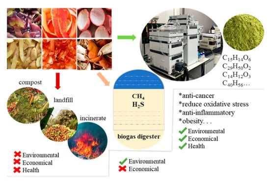 56. Sagar, N.A.; Pareek, S.; Sharma, S.; Yahia, E.M.; Lobo, M.G. Fruit and vegetable waste: Bioactive compounds, their extraction, and possible utilization. Compr. Rev. Food Sci. Food Saf. 2018, 17, 512–531. [Google Scholar] [CrossRef] [PubMed]