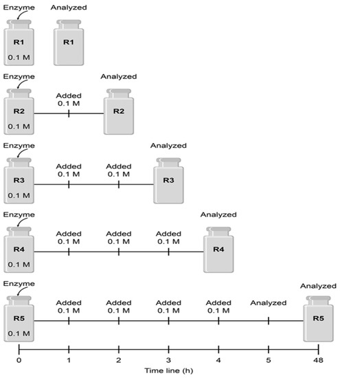 The fed-batch protocol is presented in Figure 1. The reaction started with using a 0.1 M equimolar concentration of monomers (1,8-octanediol and octanedioic acid). Then, consecutive additions equivalent to 0.1 M of monomers every hour were made, up to a total of both monomers’ concentration of 0.5 M.