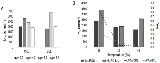 Figure 2. POS molecular weight (Mw) and relative activity (A/A0) in a miniemulsion of CRL and BCL at different initial pH values (3.3, 4.0, 5.0, 6.0) at 25 °C (A) and different temperatures (25 °C, 35 °C, 45 °C) for CRL and BCL at pH 4.0 and 5.0, respectively (B). Reaction conditions: equimolar monomer (1,8-octanediol and octanedioic acid) concentration (0.5 M); 250 rpm; enzyme: 5 mg mL−1 of free enzyme preparations; reaction time 48 h.