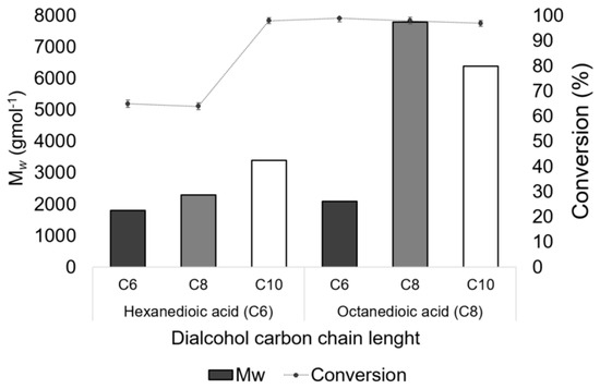 The effect of the acid and alcohol carbon chain length on polyester synthesis by PBLI in a miniemulsion was assessed for hexanedionic (C6) and octanedioic (C8) diacids, while the diol carbon chain length increased from C6 to C10 atoms for both diacids.