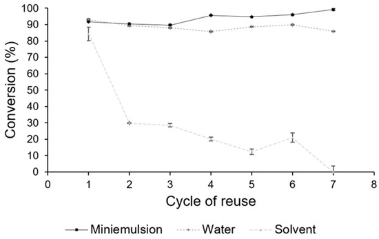 Aqueous miniemulsions (oil-in-water (o/w)) are systems characterized by oil droplets in the range between 200 and 300 nm, dispersed in a continuous water phase, which contributes to about 80% (w/w) [37]. Several reactions have been carried out in miniemulsion systems using enzymes by our research group, such as high-added-value ester synthesis using various lipases and cutinases [38,39,40], resolution of enantiomers with Candida antarctica lipase B (CALB) [41], triglyceride hydrolysis, and glycerolysis with Pseudomonas cepacia [42]. More recently, aldol reactions were performed using Rhizopus arrhizus lipase [43]. Additionally, aqueous miniemulsions have been reported as environmentally benign enzymatic reaction media for polymerization [37,44]. In these polymerization media, there is no need to dry reagents before the polymerization, the water produced in dehydrative polyesterification is expelled to the continuous (aqueous) phase, and the biocatalyst stability is improved in comparison to an organic solvent. Moreover, there is more efficient product separation [44]. The acid-catalyzed polyesterification in the miniemulsion process allows the synthesis of hydrophobic polyesters under very favorable conditions such as low temperature [11,12].