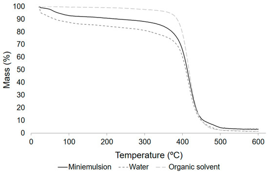 The thermogravimetric analysis of the POS synthesized allows the verification and suggestion of this polymer’s potential applicability [61]. The thermograms and the data of maximum temperature (Tmax), the temperature of the extrapolated beginning (Tonset), and the melting temperature (Tm) of the POS synthesized in the miniemulsion, water, and the organic solvent are shown and presented in Figure 8 and Table 6.