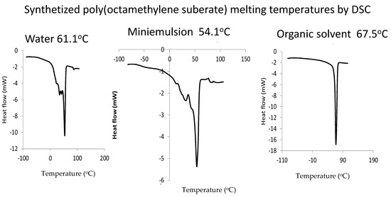 DSC analysis was performed to confirm the melting temperature and the ease of processing the poly(octylmethylene suberate) synthesized in the different polymerization media. The thermal properties of the polyesters are shown in Figure 9.