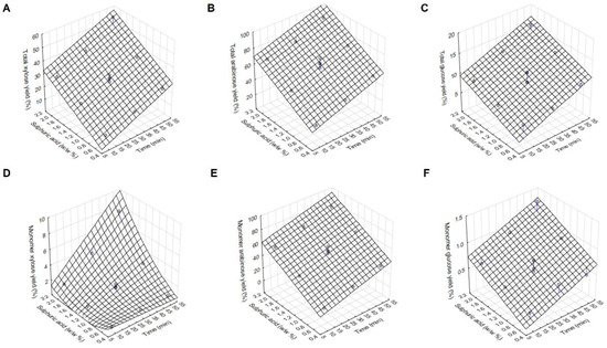Fitted surfaces of the total xylose yield (A), total arabinose yield (B), total glucose yield (C), monomer xylose yield (D), monomer arabinose yield (E), and monomer glucose yield (F). Scales are fitted according to the maximum value of each response variables.