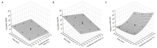 where Y is the dependent variable, X1 and X2 are the independent variables, b0 is the intercept, b1, b2 are the linear terms, b12 is the term of the interaction between the two independent variables, and b11 and b22 are the quadratic terms. The statistical evaluation was performed by StatisticaTM v.13 software (TIBCO Software, Palo Alto, Santa Clara, CA, USA). The adequacy of the models was tested by F-test (α = 0.05 significance level). The models were reduced by the non-significant variables. The effect of the independent variables was also checked by Pareto chart. In the model equations of the first acidic hydrolysis (Equations (3)–(11)), the reaction time is referred to as T expressed in minutes, and the sulphuric acid concentration is referred to as S expressed in w/w%.