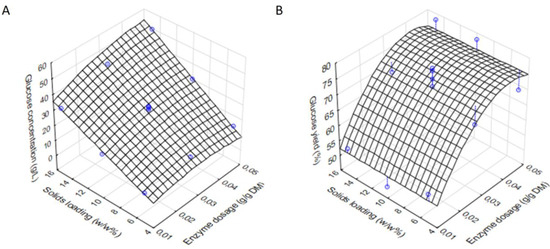 Fitted surfaces of glucose concentration (A) and glucose yield (B) obtained in designed experiments of the enzymatic hydrolysis step.