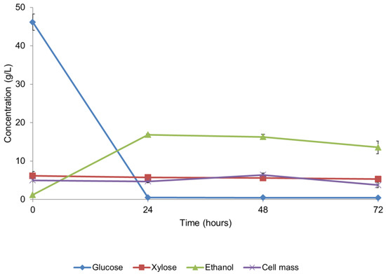 The glucose content was almost completely consumed within 24 h of ethanol fermentation. In the cell concentration (5 g/L initial concentration), a slight decrease was observed during the fermentation, resulting in 4 g/L at the end. The xylose concentration did not change considerably as the baker’s yeast (S. cerevisiae) cannot use the pentose sugars efficiently [74,75]. Thus, the ethanol production was completed after 24 h. The maximum concentration of ethanol was 16.9 g/L and it was reached after 24 h. After reaching the maximum ethanol concentration, the amount of ethanol was slightly decreased until the end of the fermentation, probably due to a slow evaporation. The ethanol yield and ethanol volumetric productivity at 24 h of fermentation were 71.6% (of theoretical) and 0.72 g/(L × h), respectively.