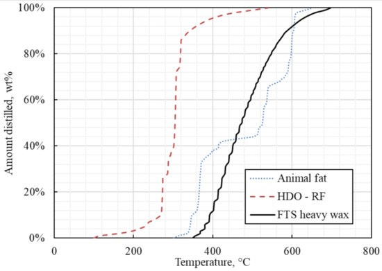 The SIMDIS of the three feedstocks used for the fast pyrolysis tests. The animal fat, the paraffins from the hydrodeoxygenation (HDO) reaction of this animal fat (HDO—RF text in the picture), and the Fischer-Tropsch (FTS) heavy fraction waxes (FTS heavy wax) are displayed in the figure.