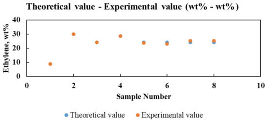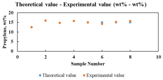 The regression coefficient was near 1 (Table 5) and the percent errors were variating from zero to 5.65 (maximum value) or −4.30 (minimum value). In addition, the theoretical values were similar to the experimental values for ethylene and propylene (Figure 2 and Figure 3). Therefore, the RSM was a useful tool to select the optimum parameters, according to the system-reactor possible conditions of the reaction (the temperature and animal fat were added in this case).