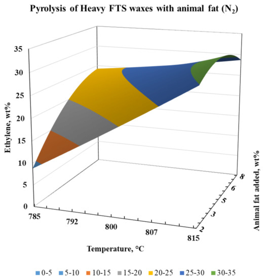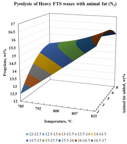 The response surface methodology was found to be a useful tool to explore the yields of ethylene and propylene using the fast pyrolysis method. The experimental and theoretical results led to predicting the final production of ethylene and propylene contents. The addition of animal fat to heavy waxes resulted in similar yields to ethylene and propylene at 815 °C. Therefore, the animal fat could be used directly as feedstock for fast pyrolysis without the need to previously deoxygenate the fat. The ethylene content in the product obtained at 785 °C was lower compared to the content in the products obtained at higher temperatures.