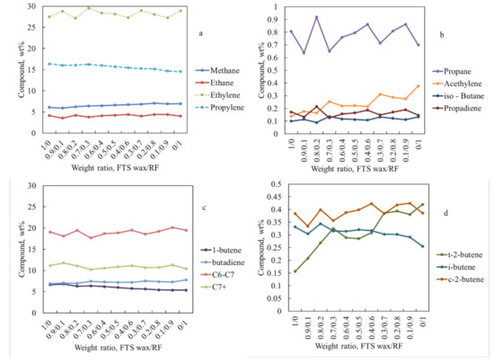 The effect of the feedstock composition on the pyrolysis product distribution was also studied. The second group of tests was carried out after selecting the best temperature with the best yield to ethylene and propylene. Heavy wax fractions from FTS were mixed with rendered fat in the following concentrations: 0, 10, 20, 30, 40, 50, 60, 70, 80, 90, and 100%.