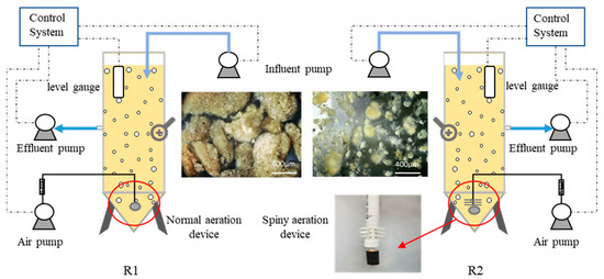 Aerobic granular sludge treating tannery wastewater was obtained in two lab-scale sequencing batch reactors (SBRs). The conventional aeration device was used in R1 and the spiny aeration device made of plastic material was used in R2 (Figure 1). The SBRs each had a diameter of 20 cm and a working volume of 11 L with a volumetric exchange ratio of 7/11. One period was 12 h and including the following procedures, influent (5 min), aeration (11 h), settling (5 min), drainage (20 min), and standing (30 min). The lab-scale reactors were operated for a total period of 70 days. The aeration volume was controlled at about 0.7 m3/h. The laboratory temperature was 15~30 °C during the whole period. It is worth noting that bioreactors for wastewater treatment would usually be exposed to temperature differences in a real-life scenario (Table S1), so the temperature in the lab was not constant artificially. But R1 and R2 had the same temperature. The SBRs were cleaned weekly to prevent biofilm formation on the wall.