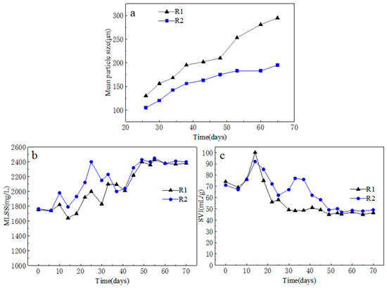 Variations in the mean particle size, mixed liquor suspended solids (MLSS), and sludge volume index (SVI) of sludge. ((a) mean particle size; (b) MLSS, (c) and SVI).