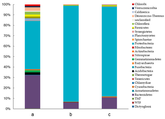 Distribution of microorganisms at phyla level ((a) inoculated sludge; (b) sludge of R1; (c) sludge of R2).