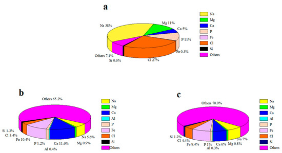 The XRF was adopted to analyze the element composition of feed water and AGS. It showed that raw water contains large amounts of Na, Cl, Ca, Mg, and P. The AGS accumulates elements such as Fe, Ca, Mg, and P. As shown in Figure 6a, influent samples were measured for the mass fraction of each element in the water and the mass fraction of the water, and the proportion of each element in the total solute mass was obtained by conversion. It can be seen from the figure that the proportion of the element Na in the feed water is 38%, 27% for Cl, followed by 11%, 11%, 5%, 0.6%, and 0.3% for P, Mg, Ca, Si, and Fe, respectively, and 7.1% for the other elements. The element distribution of the AGS in R1 was shown in Figure 6b. Ca and Fe account for a larger proportion, 11.6% and 10.4%, respectively, followed by Na, Cl, Si, P, Mg, Al, and other elements as 5.6%, 3.4%, 1.3%, 1.2%, 0.9%, 0.4%, and 65.2%. The element distribution of AGS in R2 was shown in Figure 6c. The elements with a larger proportion were Fe, Na, and Ca at 8.4%, 7%, and 6%, followed by Cl, Si, P, Mg, Al, and other elements at 4.4%, 1.2%, 1%, 0.8%, 0.3%, and 70.9%, respectively. Comparing the elements in feed water and AGS, it could be seen that Fe and Ca were heavily enriched in the granular sludge. The content of elements Fe and Ca in R1 was greater than that in R2, but the content of elements Na and Cl was less than that in R2. The proportions of other elements were similar in these two reactors.