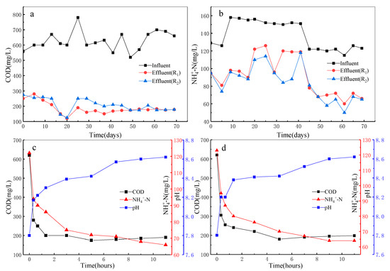 Performance of the reactors ((a) chemical oxygen demand (COD); (b) ammonia nitrogen (NH4+-N), (c) COD, NH4+-N, and pH of R1; (d) COD, NH4+-N, and pH of R2).