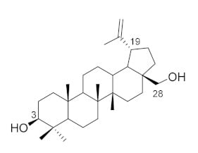 Betulin 1, derived from white species of birch bark, exhibits a wide spectrum of activity, including anticancer, antimicrobial, anti-viral, and anti-inflammatory properties. The chemical structure of betulin 1 contains four six-membered rings and one five-membered ring. Additionally, in their structure, there are two hydroxyl groups at the C-3 and C-28 positions, and an isopropenyl group at the C-19 position (Figure 1). Modification at these positions can lead to new semi-synthetic derivatives, which exhibit a better biological activity and bioavailability [9,10].